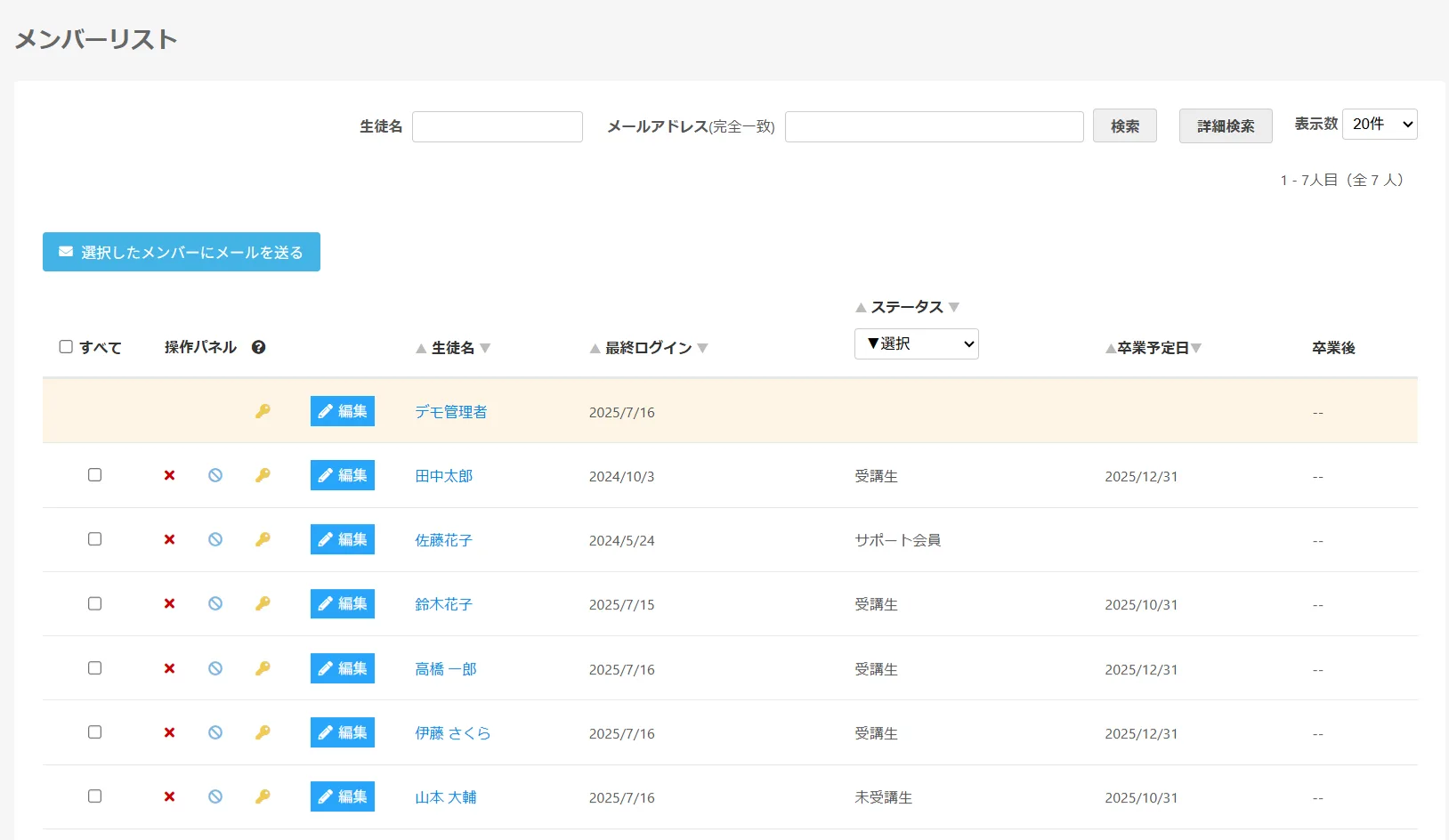 新規生徒の登録は、簡単な入力だけで完了します。登録と同時にログイン案内メールが自動送信されるため、あなたが個別にメールを作成する必要はありません。生徒情報の一覧確認や編集、卒業時のアカウント停止なども、管理画面からワンクリックで操作可能です。