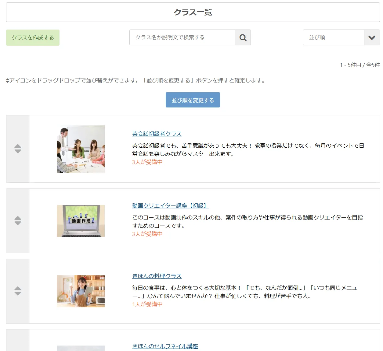 StandOnの生徒用マイページに表示された体系的なクラス一覧の例