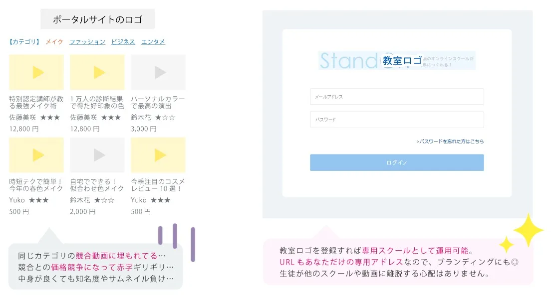 無料プラットフォームでは、視聴後に他人の動画が表示されたり、広告が出てきたりと、生徒さんの集中が削がれがちです。スタンドオンなら、自社ロゴの設置と専用URLにより、あなたの世界観だけで統一された専用空間を作れます。